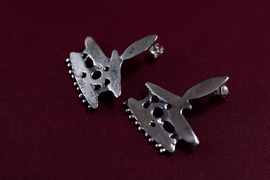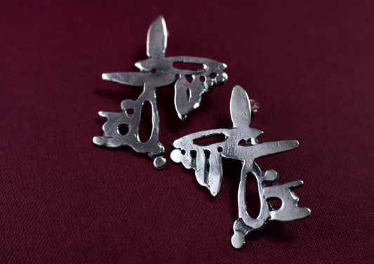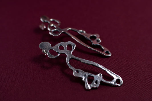 Silver earrings crafted from sketches straight out of the artist's sketchbook. The artist transfers her drawings into tangible, wearable art to complement your look. These earrings are a perfect example of attention to detail. The wax carving technique enables experimentation, and the beauty of these earrings is the result of those experiments.